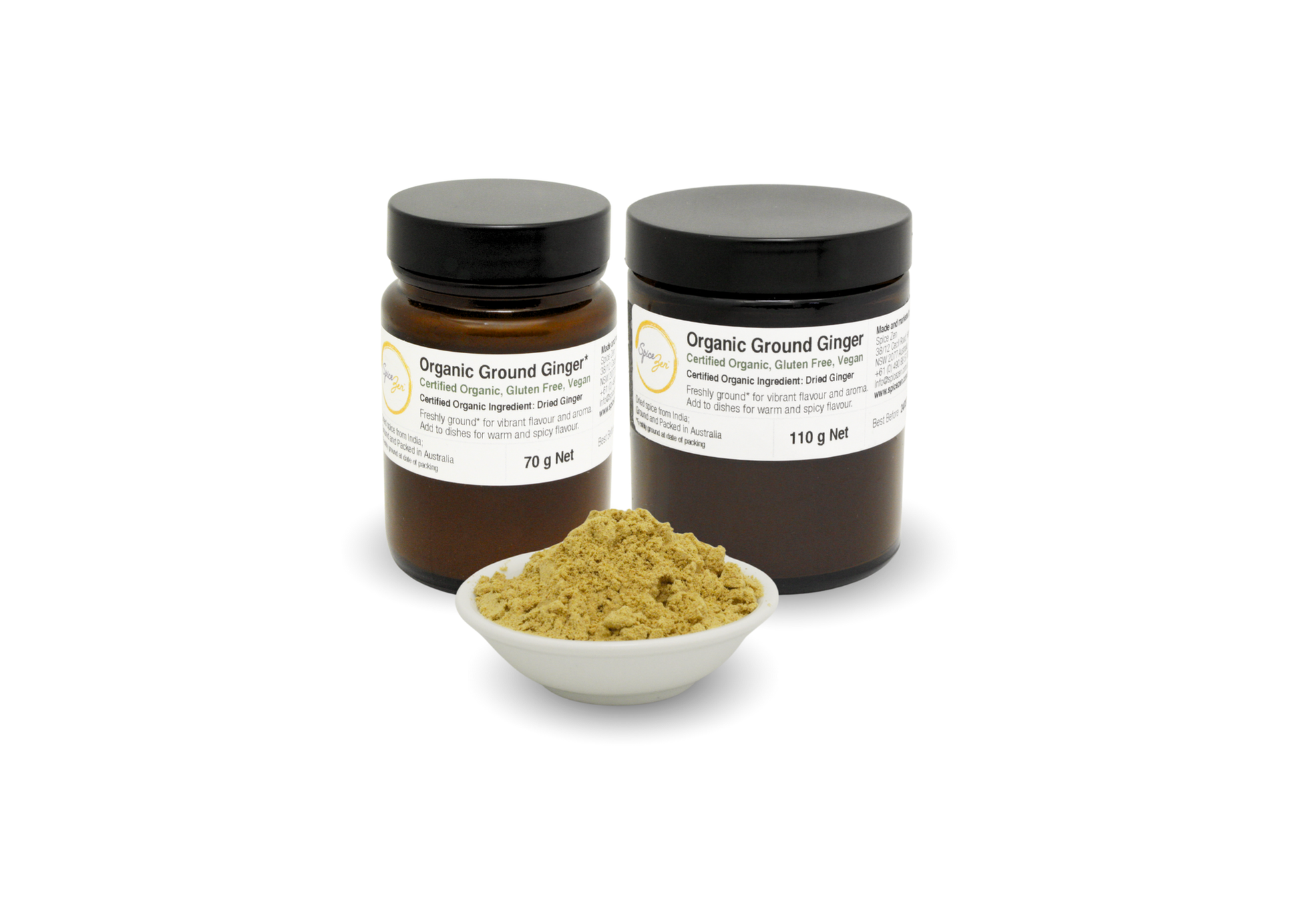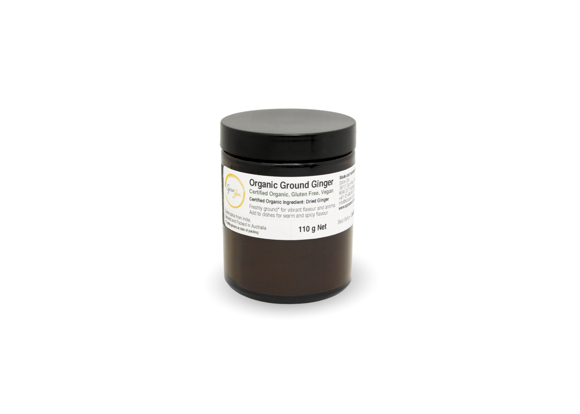 Spice Zen certified organic ground ginger is freshly milled at our gluten-free Sydney facility in small batches to preserve their natural purity and crafted without anticaking agents, fillers or processing aids. Immediately sealed in amber glass jars, the powder retains its lively aroma, warm spice notes and clean, citrus-lifted finish.
