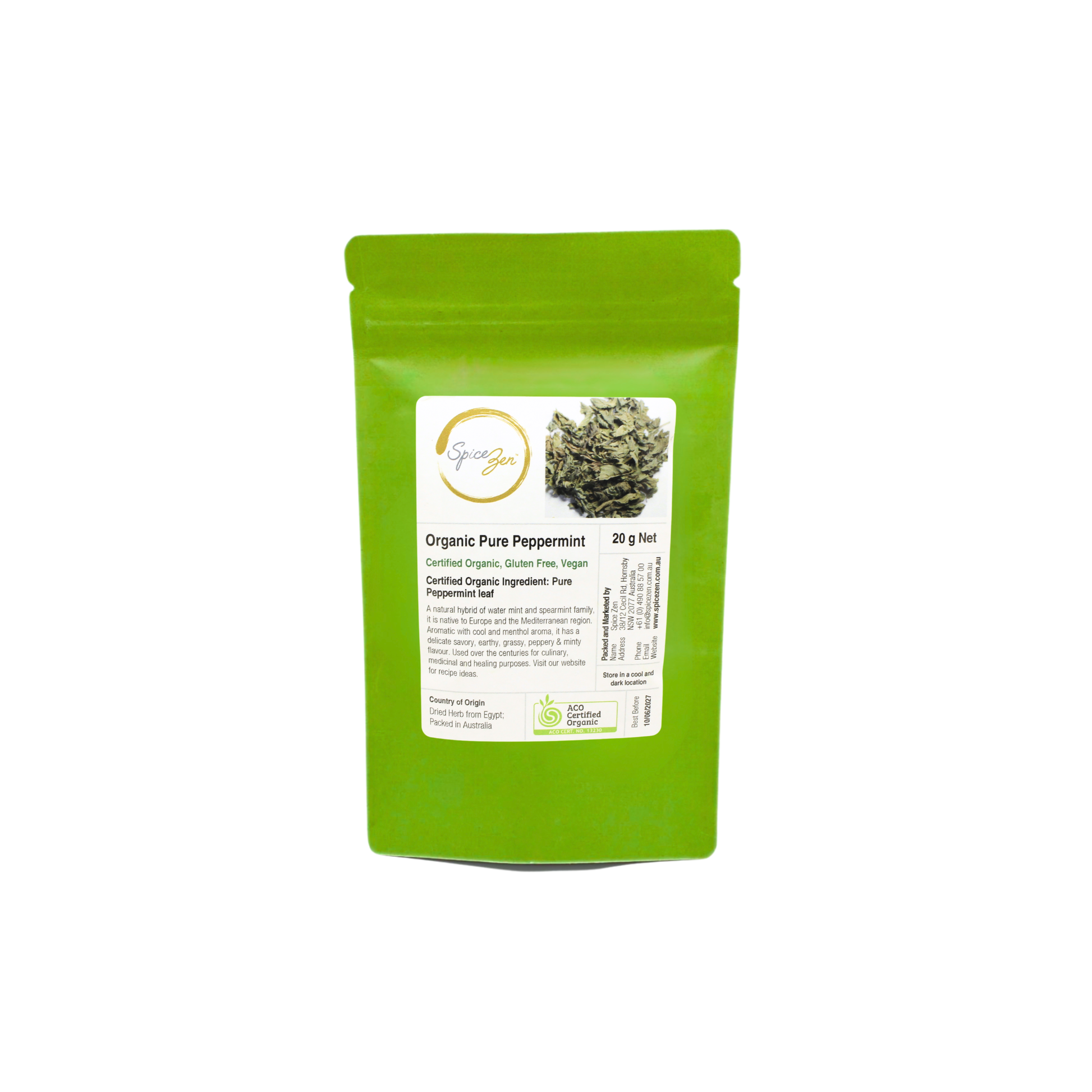 Spice Zen’s Certified Organic Peppermint is premium large leaf. It is quality checked and hand-packed in our gluten-free Sydney facility to retain its natural colour, aroma and cooling intensity. Packed fresh in our signature green botanical pouches, it is a versatile, everyday herb for tea, kitchen use and botanical craft.