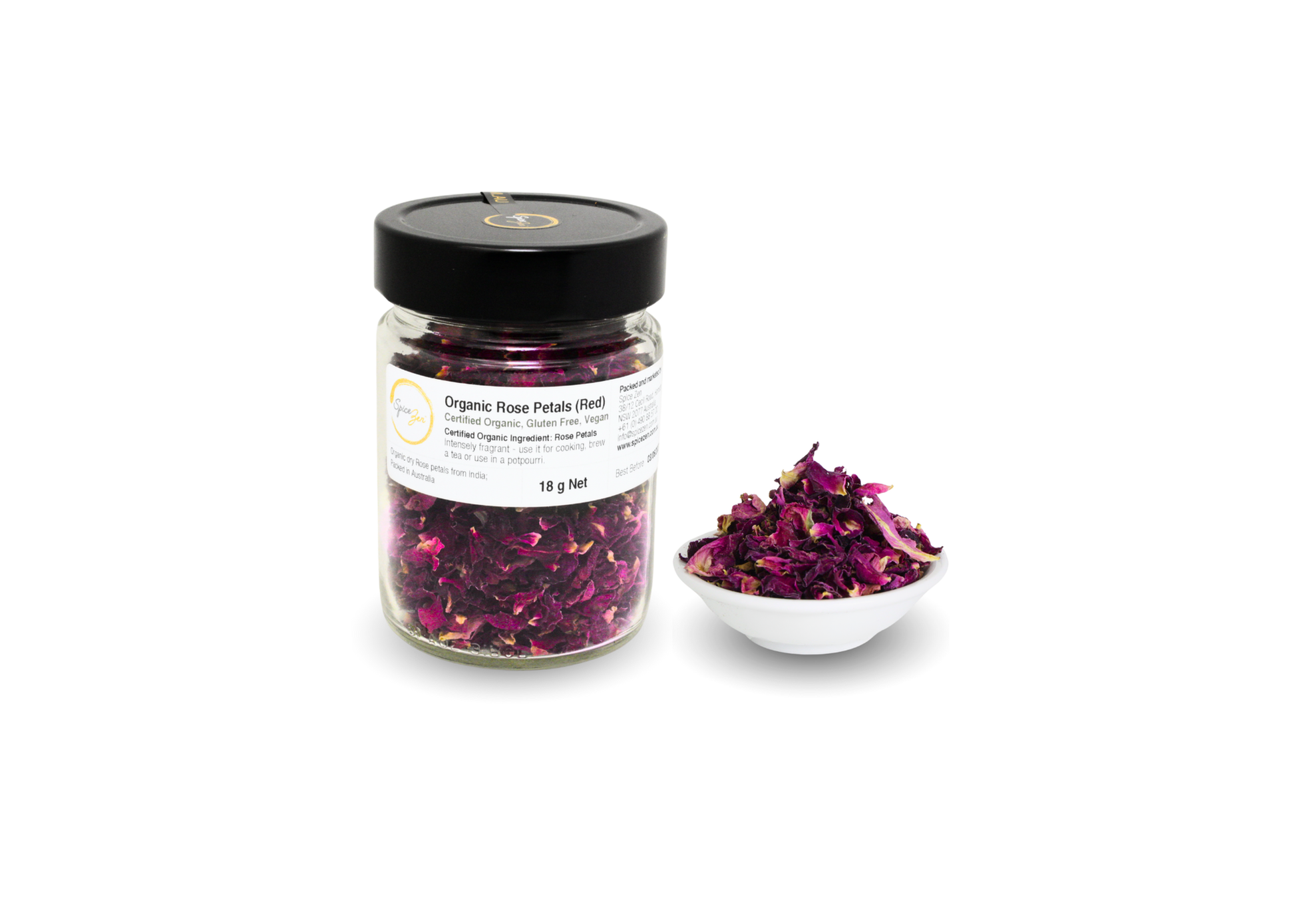 Spice Zen’s Certified Organic Red Rose Petals are quality checked and hand-packed in our gluten-free Sydney facility to retain their natural colour, structure and aroma. Packed in a clear glass jar, they are designed to be both functional and beautiful, inviting regular use across tea, culinary and ritual spaces.