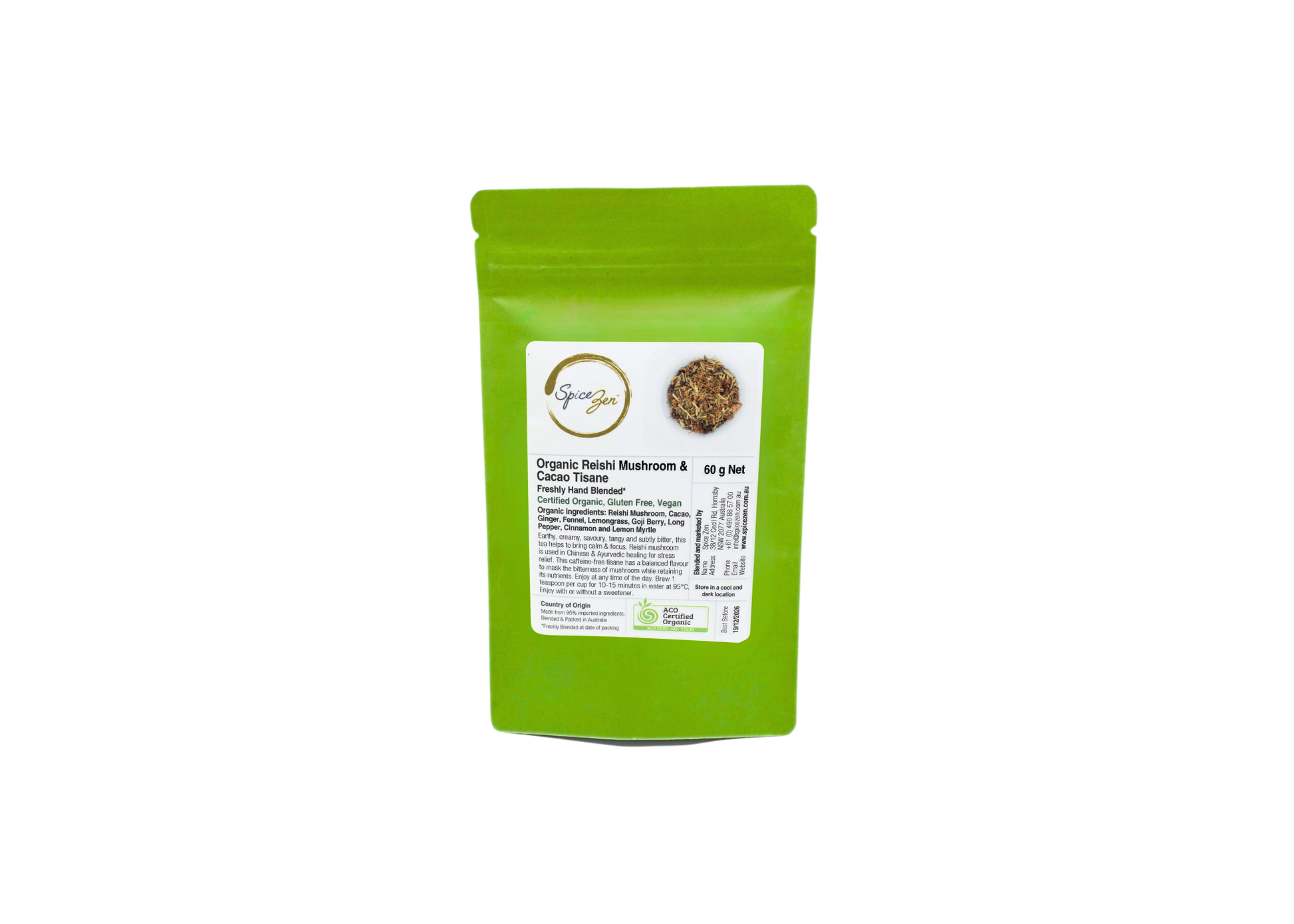 Certified organic and gluten free. Packed in biodegradable, resealable stand-up paper green pouches with inner foil for freshness and colour protection. Store in a cool, dry place away from direct light.