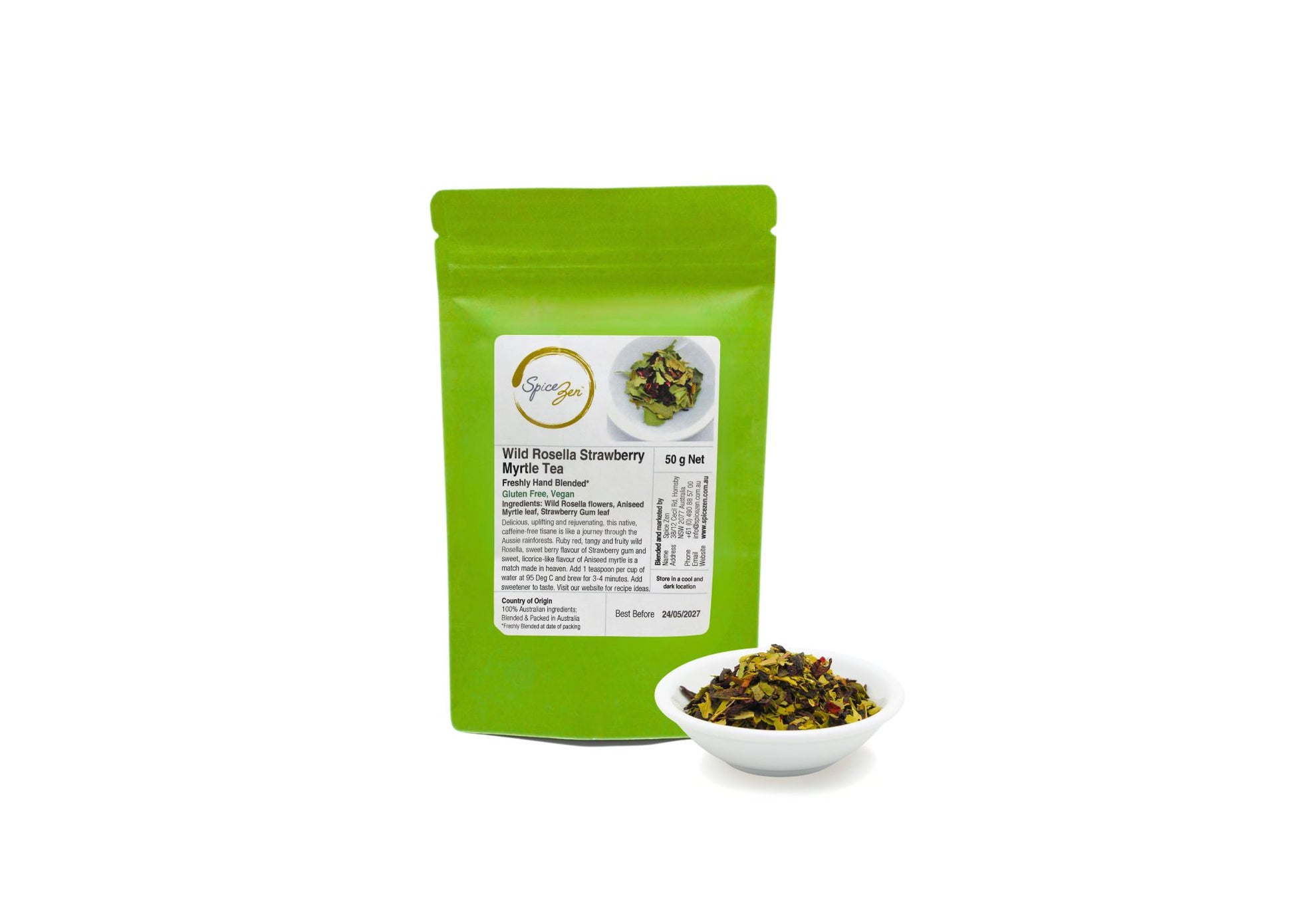 Hand blended and packed in Sydney in biodegradable, resealable stand-up green pouches with inner foil to protect colour and aroma.